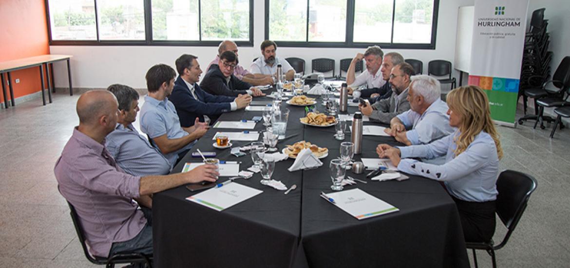 Hoy por la mañana se llevó adelante un nuevo encuentro entre Intendentes y rectores de Universidades Nacionales en la Universidad Nacional de Hurlingham. El mismo contó con la participación de los rectores Jaime Perczyk (UNAHUR), Federico Thea (UNPAZ), Alejandro Villar (UNQ), Hugo Andrade (UNM), Roberto Gallo (UNO), Jorge Calzoni (UNDAV), Ernesto Villanueva (UNAJ) y de los Intendentes Fernando Gray (Esteban Echeverría), Juan Zabaleta (Hurlingham), Alberto Descalzo (Ituzaingó) y la jefa de gabinete de Cañuelas Marisa Fassi.