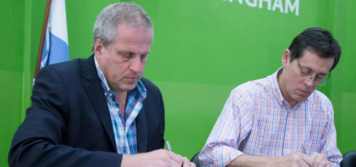 Ayer por la tarde el Rector Lic. Jaime Perczyk firmó un contrato de obra con el Ing. Luis García, socio gerente de la constructora GECONPE para poner en marcha la "construcción núcleo sanitario, kiosco y SUM" en la sede Origone. De esta forma, la Universidad incorporará, en el año próximo, nuevos baños, un kiosco y una sala de usos múltiples, sumando más de 400mts2 para ser utilizados por toda la comunidad educativa.